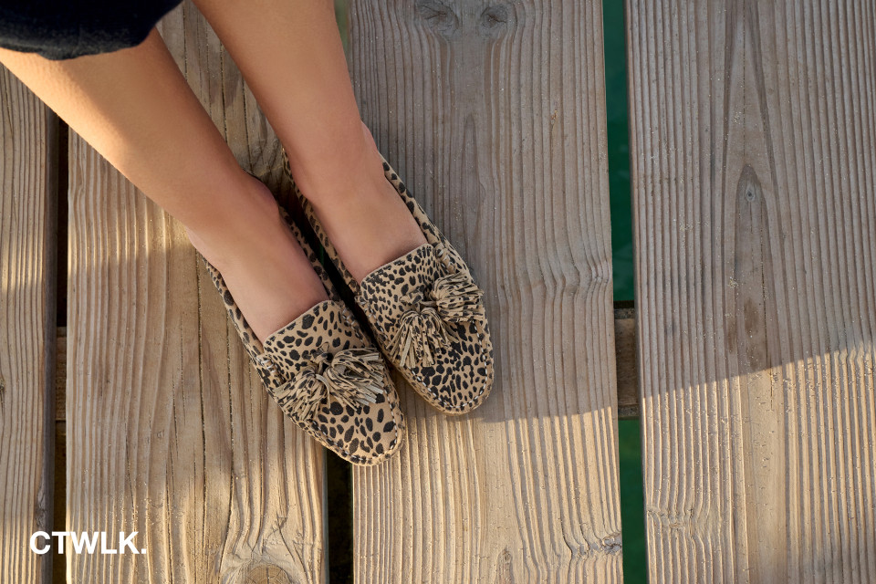 Driver moccasins continue to perform as a key category, confirming the shift toward moccasins as an alternative to sneakers. Soft suedes in light pink, faded denim blue, and beige keep the palette fresh, while subtle leopard accents introduce a refined take on quiet statement prints