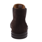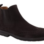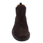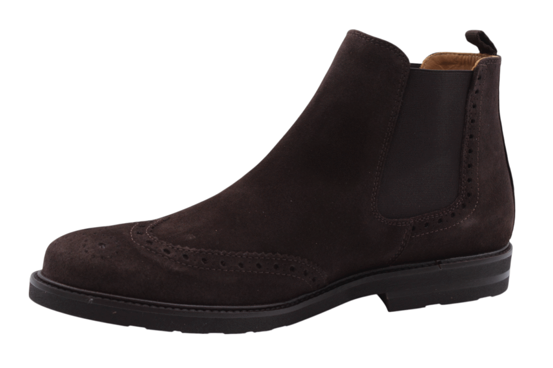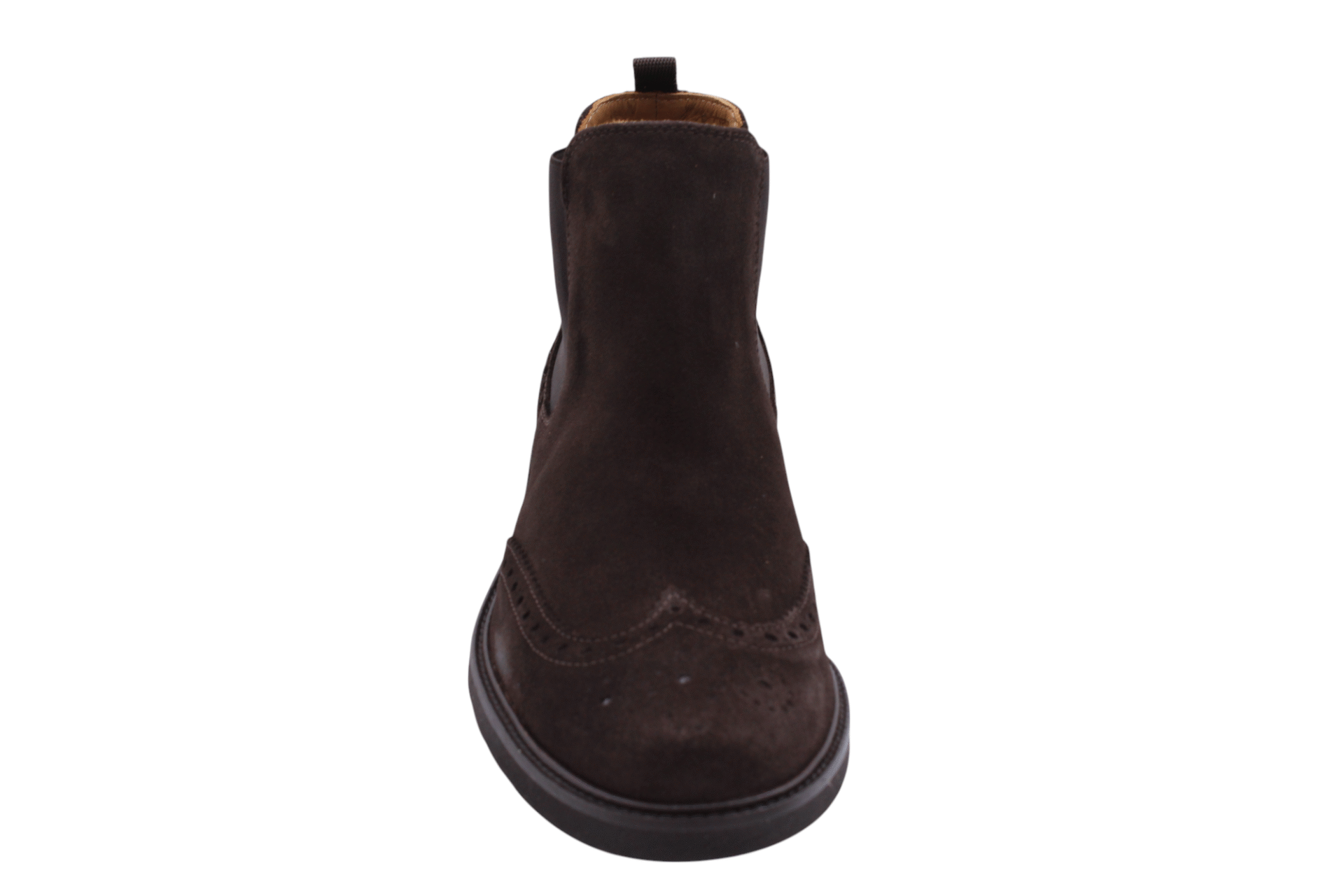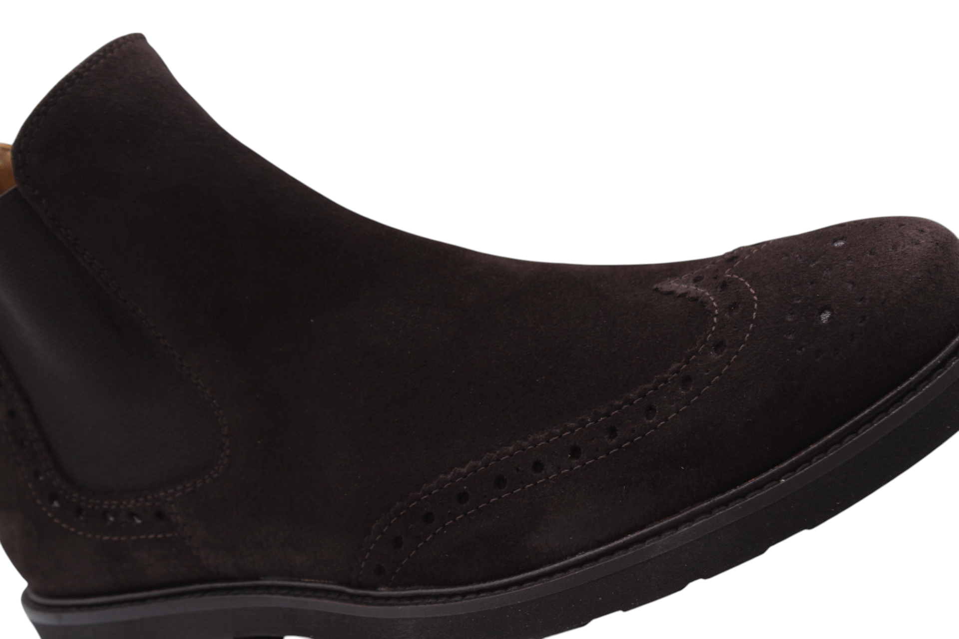 Dark Brown colored suede chelsea bootie with brogues. Leather insole and full leather lining. Lightweight outsole.