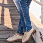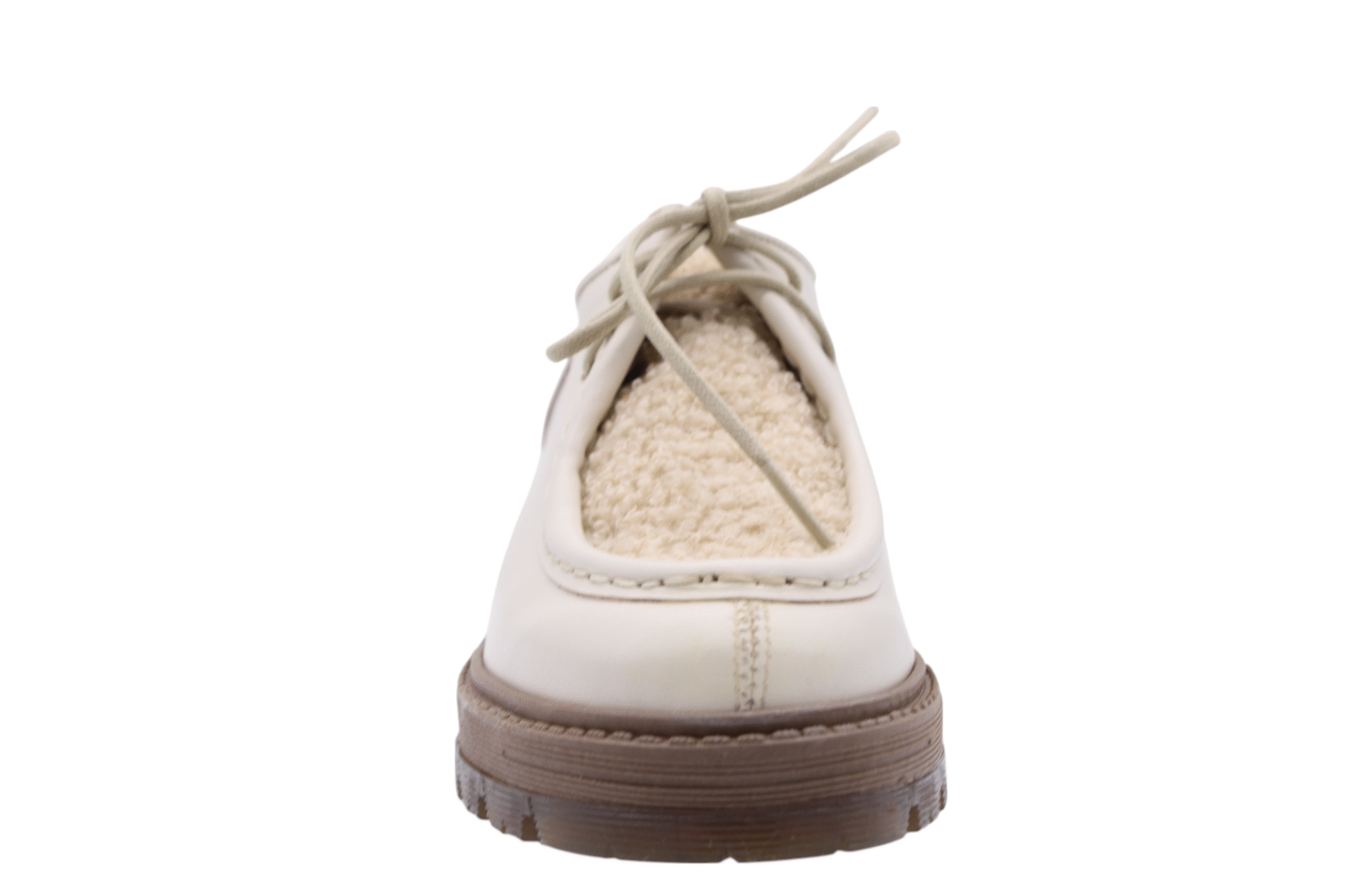 Ecru colored leather derby shoe. Full soft leather lining. Rubber outsole. Faux fur only at the outside.