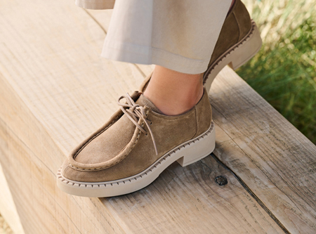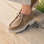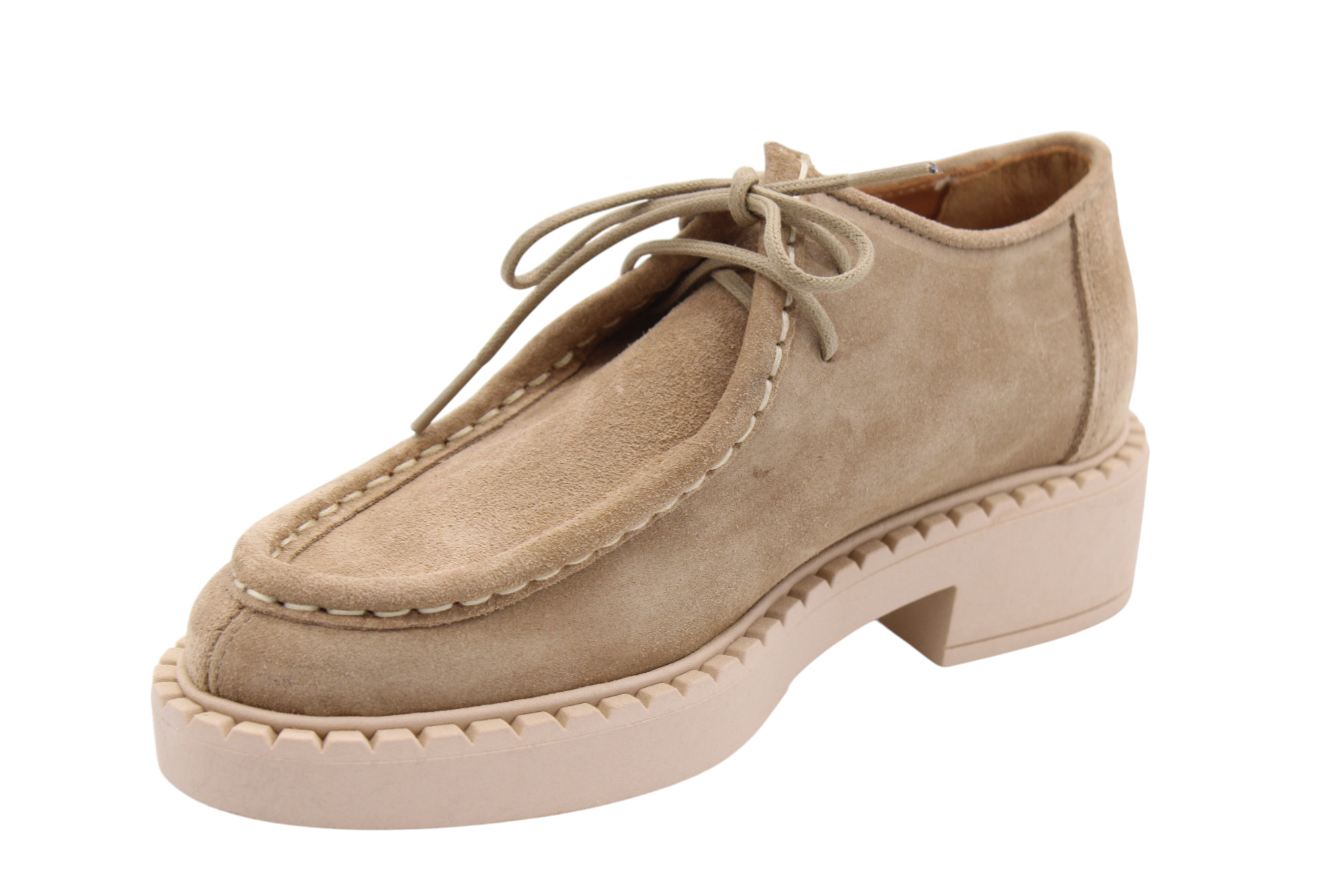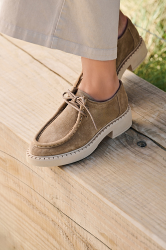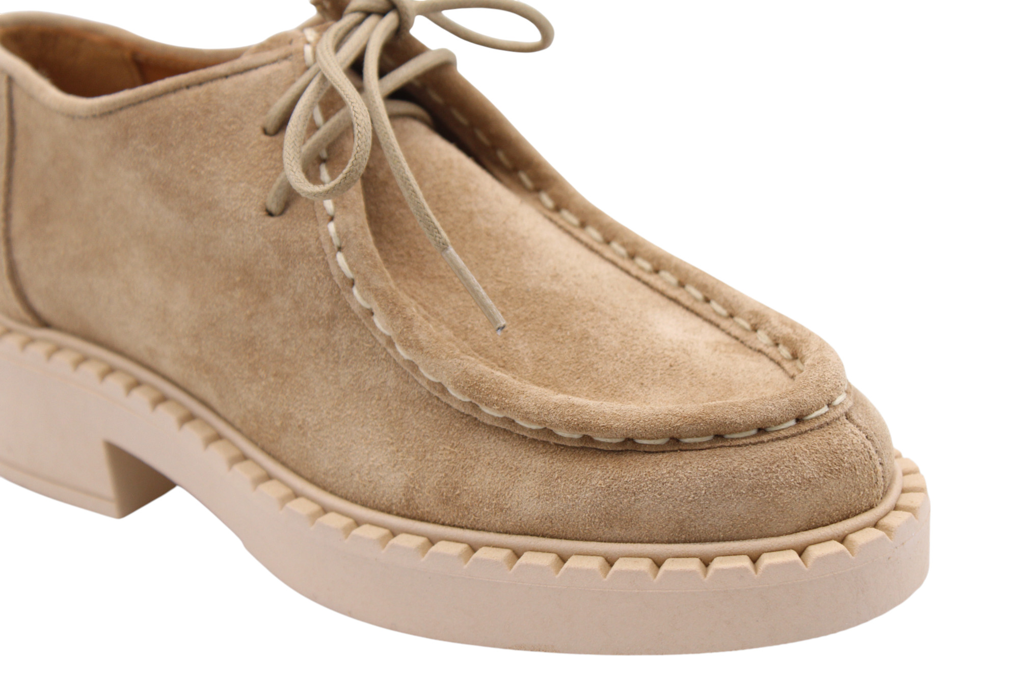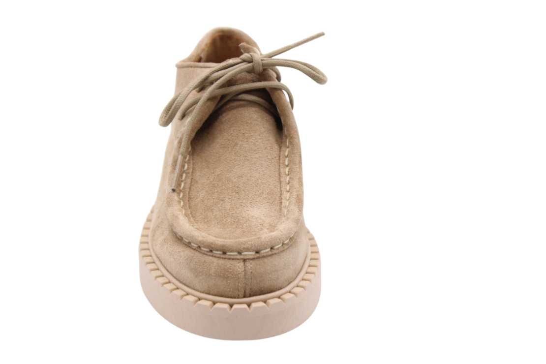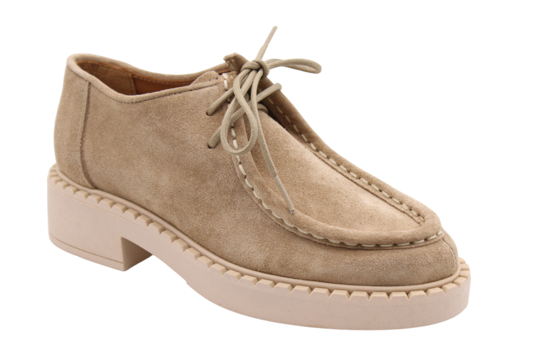 Beige colored suede derby. Full leather lining inside. Rubber lightweight outsole. Same style as Shane but without Fur.