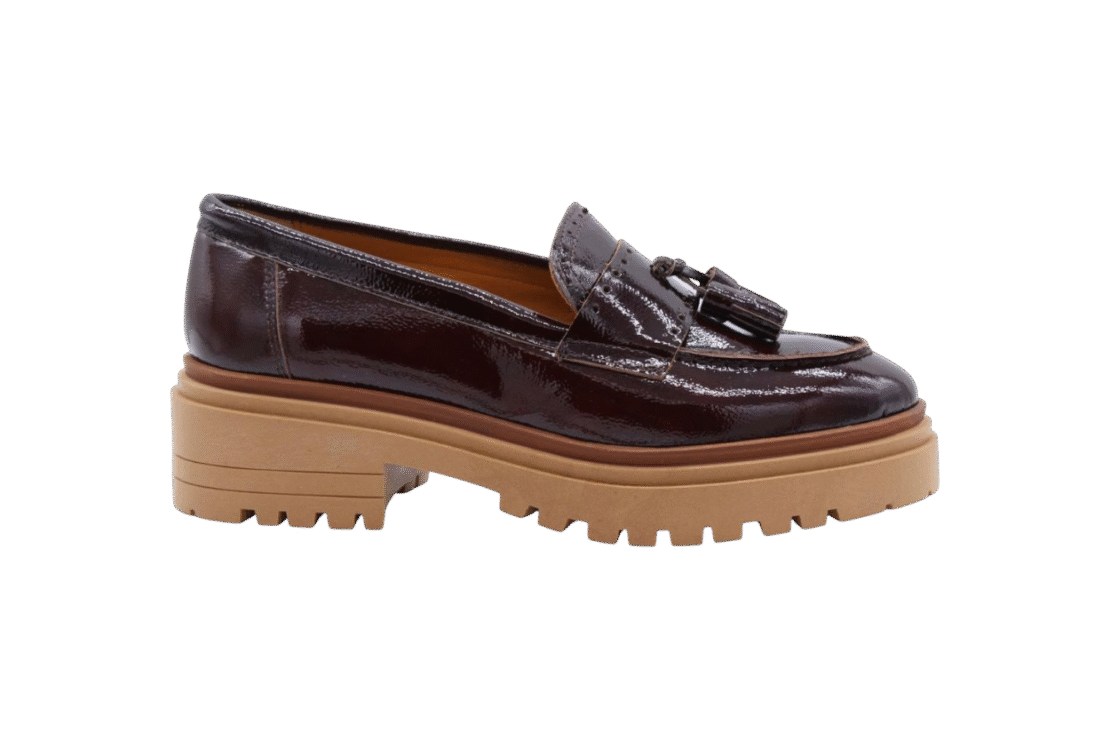 Brown-bordeaux/Niger Oscuro colored patent bootie on blockheel. Blockheel is 6cm and platform is 2cm which makes the official height an easy 4cm. Full leather lining.