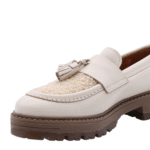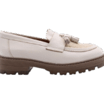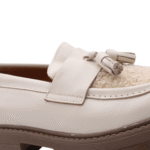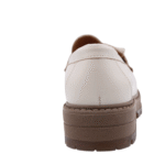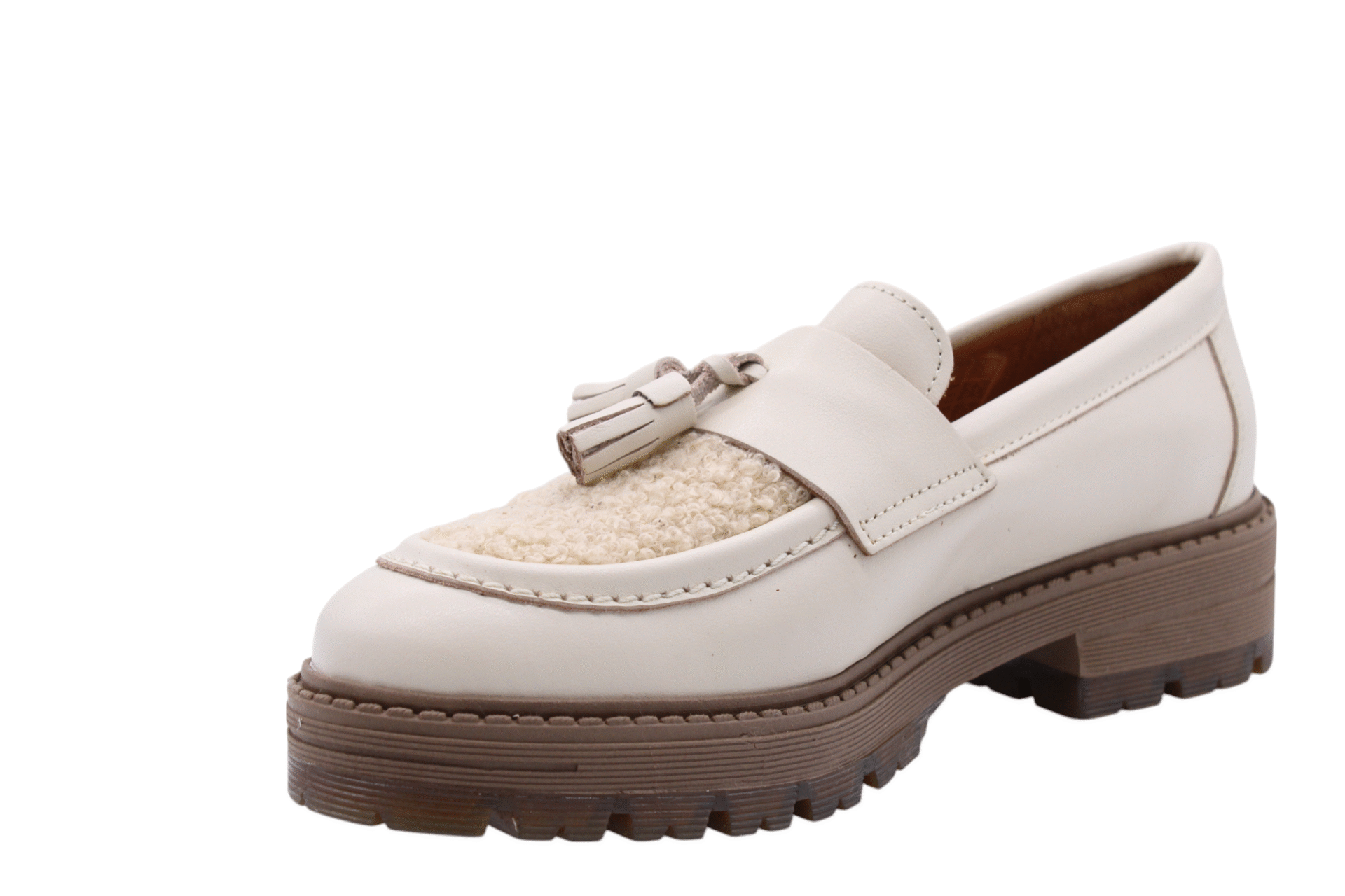 Ecru colored leather moccasin shoe. Full soft leather lining. Rubber outsole. Faux fur only at the outside.
