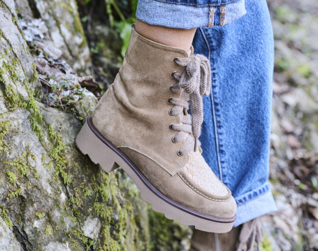Dark beige /Tasso colored suede laced-up bootie. Full leather lining. Faux fur only on the outside. Rubber lightweight outsole. Zip on inside.