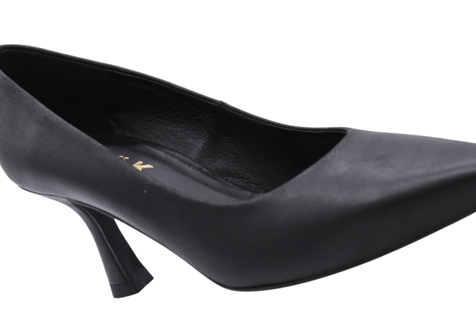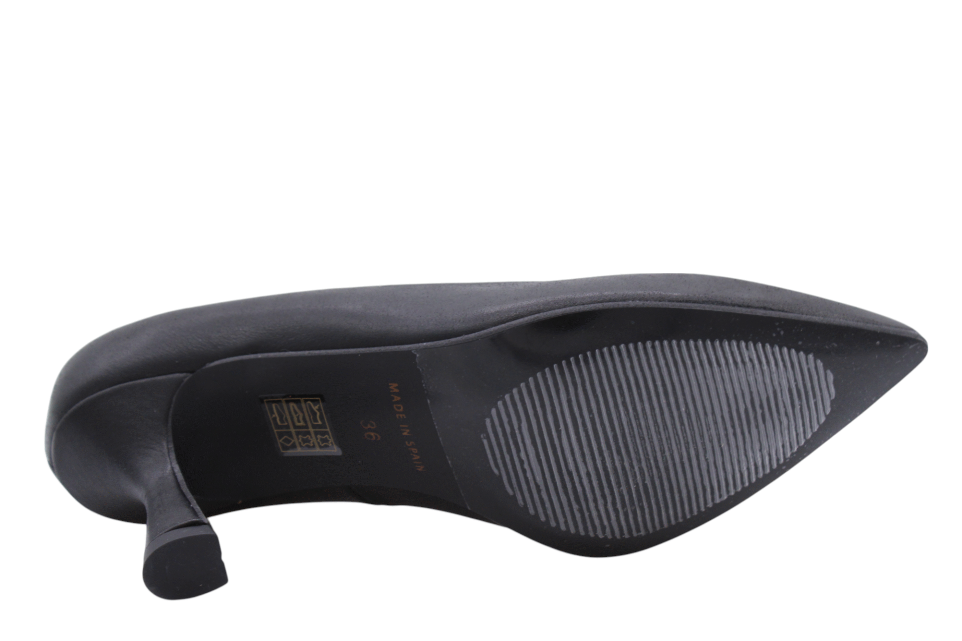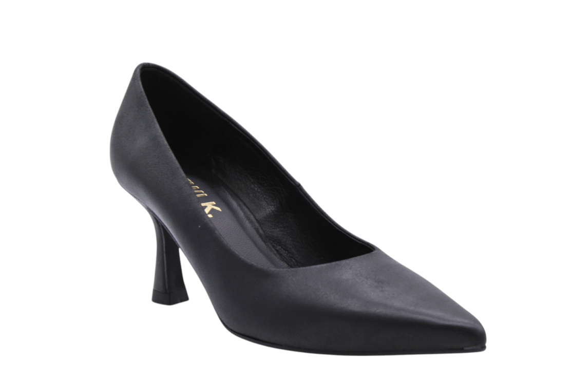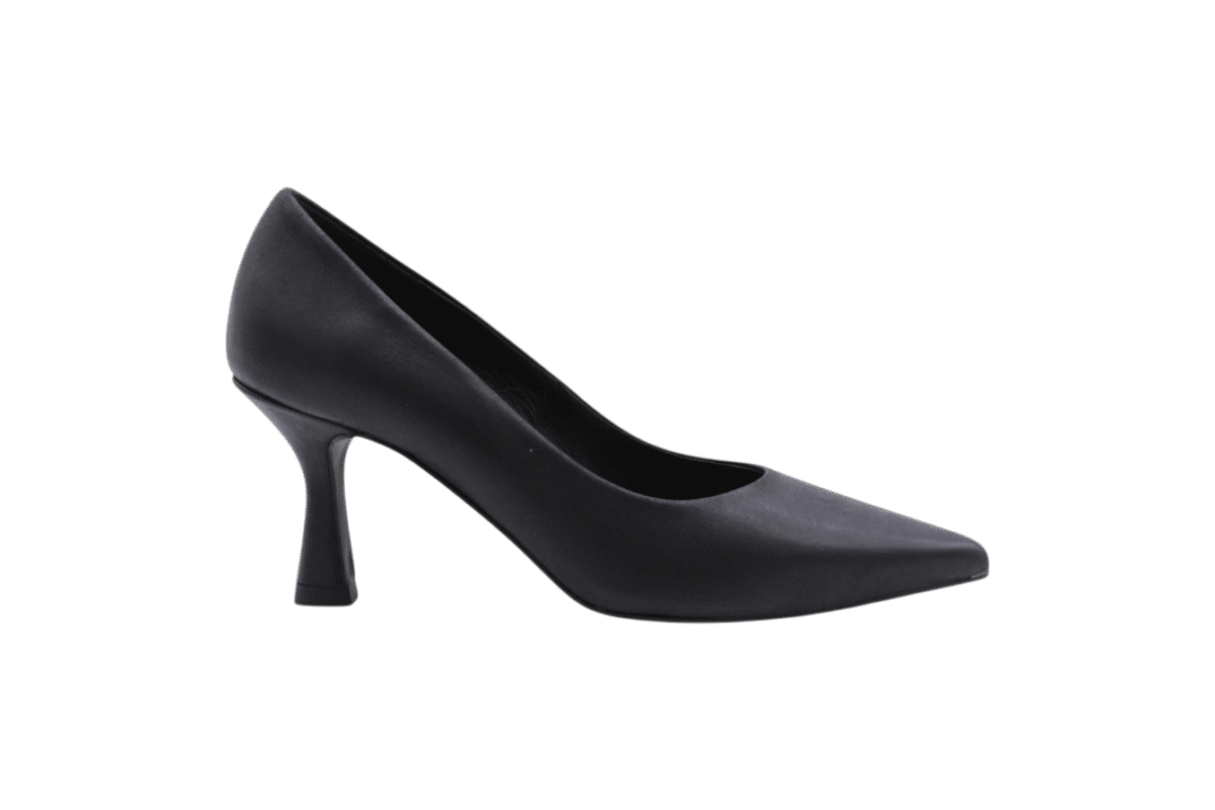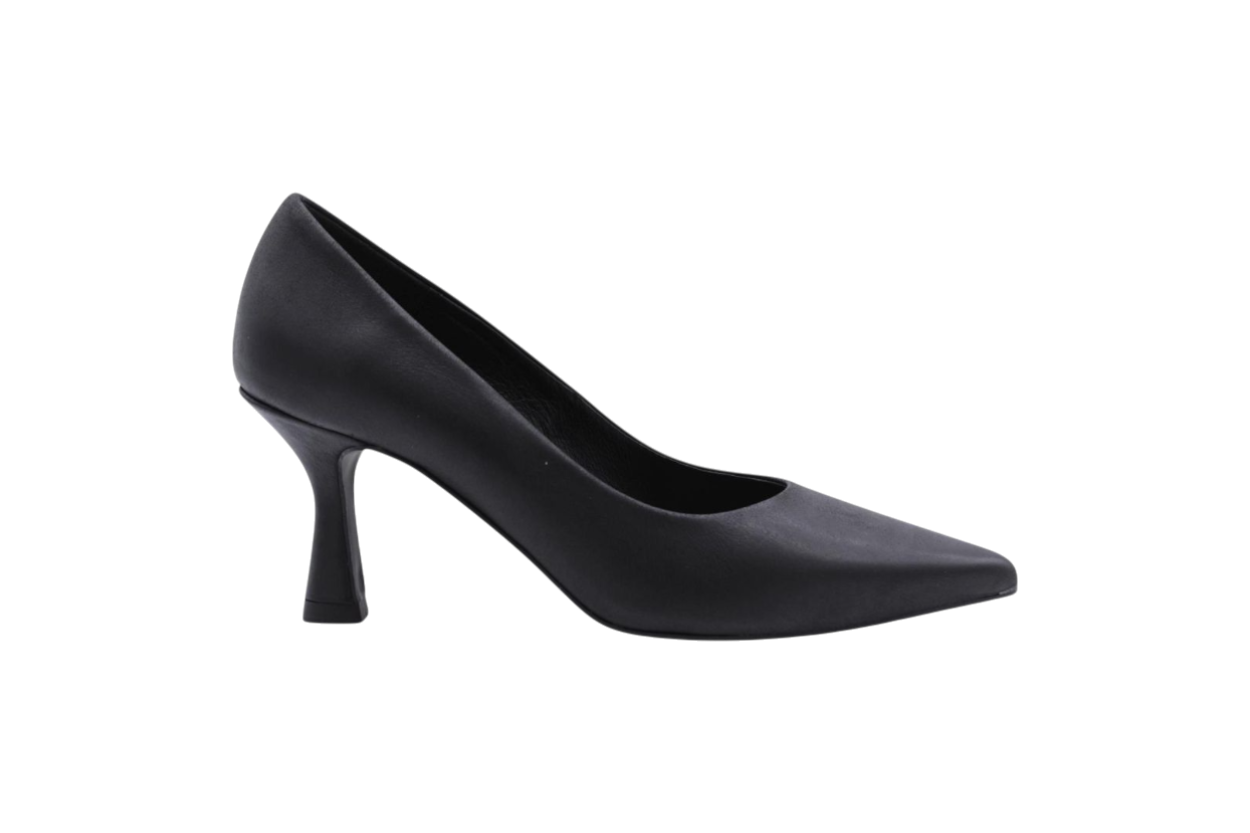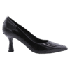 Black colored metallic suede and leather combi pump on heel of 5cm. Full cow-leather lining. Leatherlook rubber outsole.