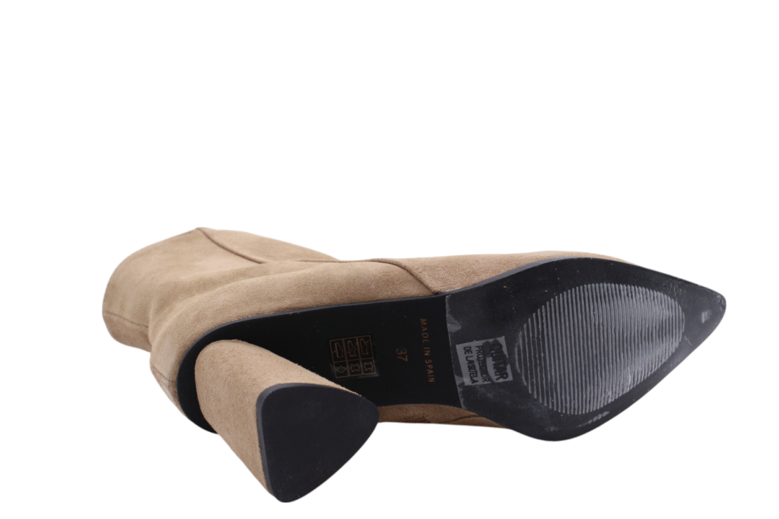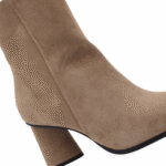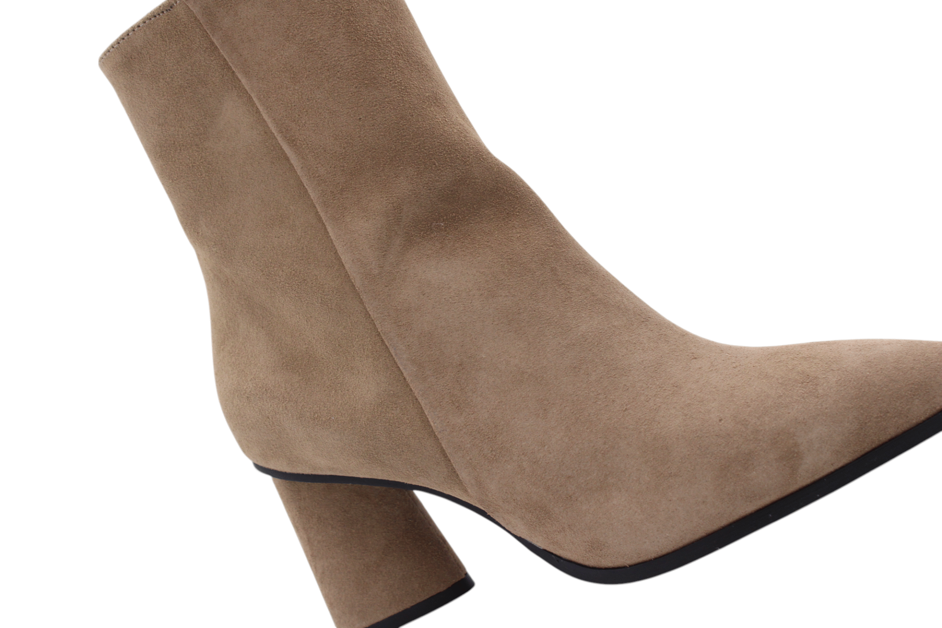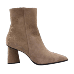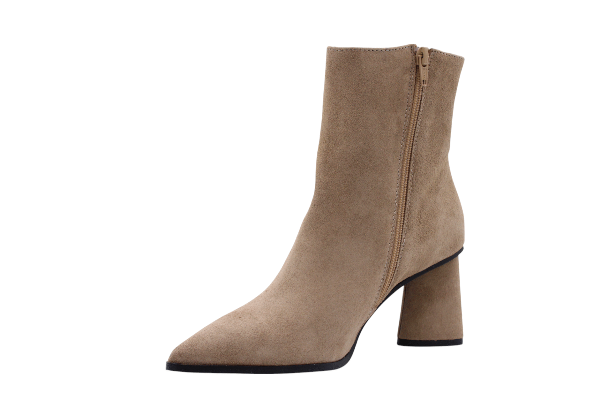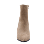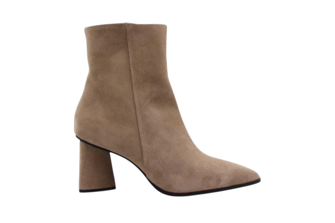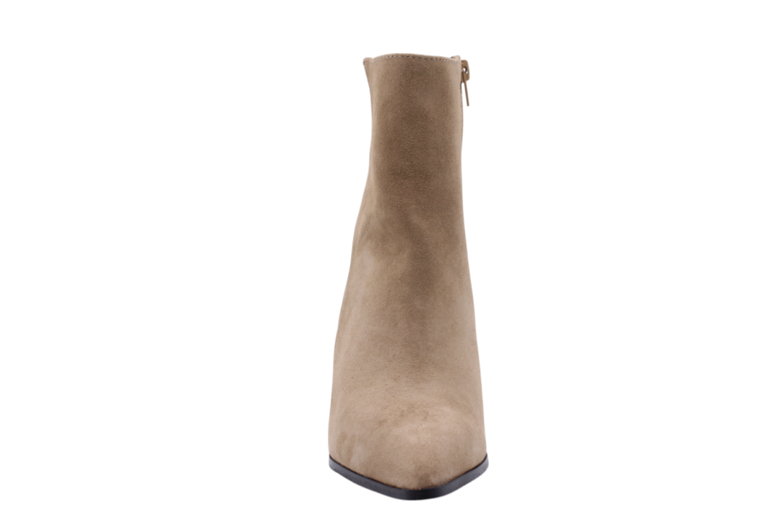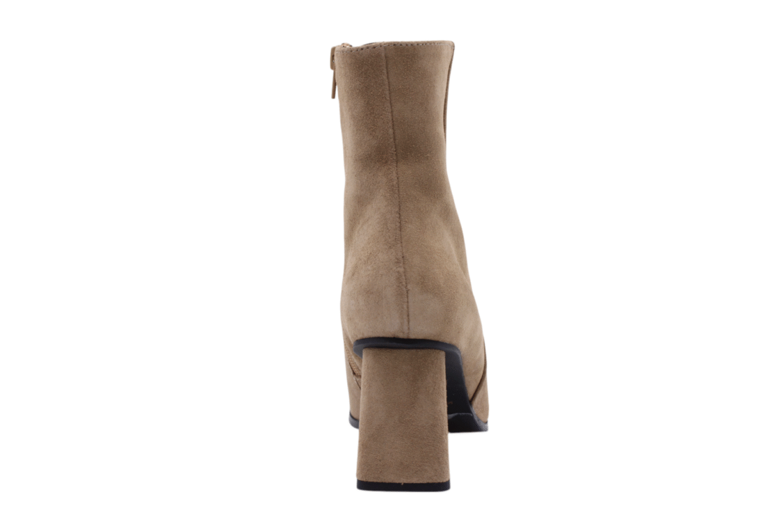 Beige/Natural colored suede bootie. Blockheel is 6,5cm. Full leather lining. Lightweight rubber outsole. Zip on inside to enter.