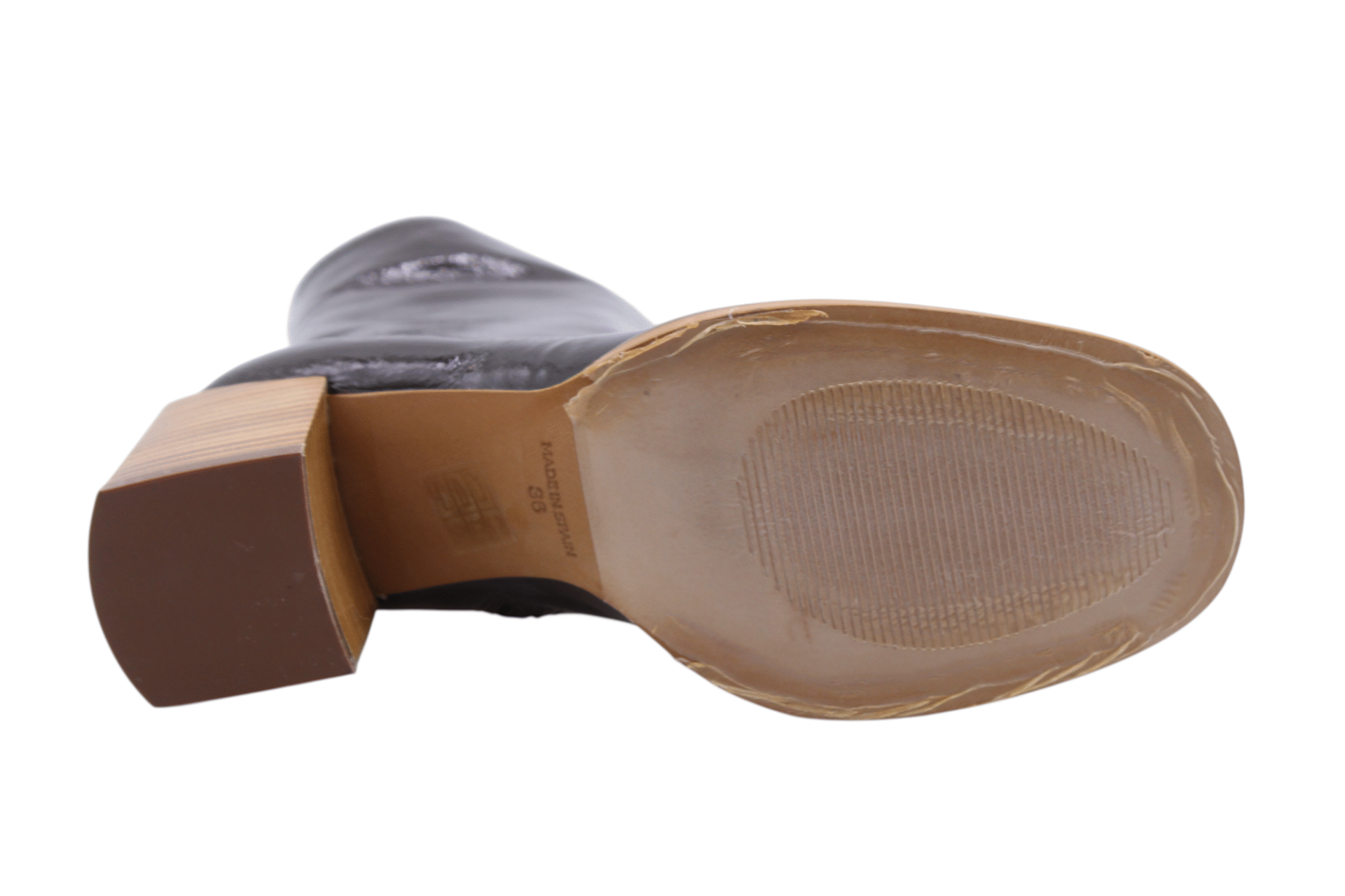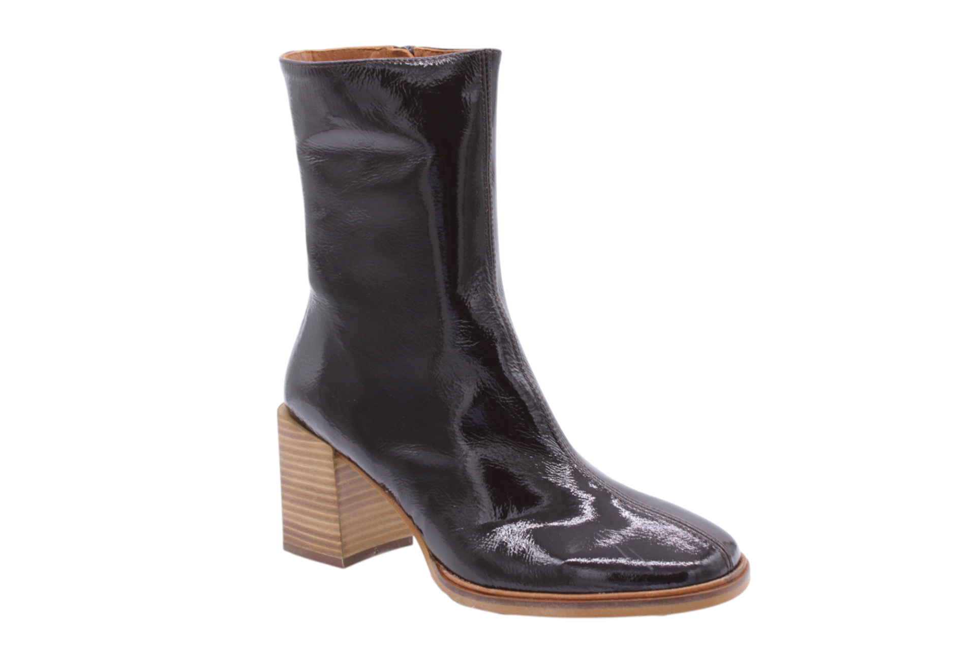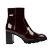Brown-bordeaux/Niger Oscuro colored naplak leather bootie on 6,5cm stacked blockheel. Full leather lining. Leatherlook outsole. Zip on inside.
